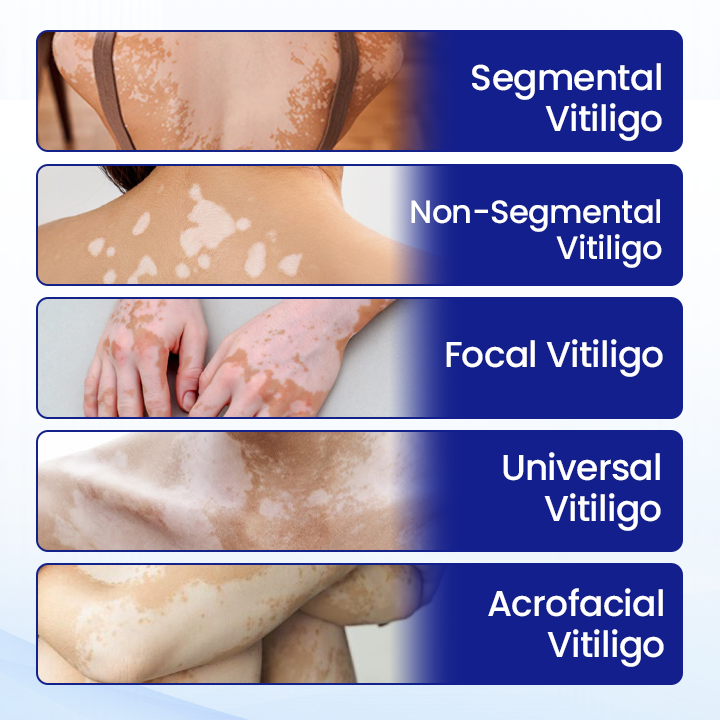 - Focal Vitiligo: 5-10% of cases (subtype of non-segmental). Small, localized patches. Limited to specific areas. May remain stable or progress to generalized type.